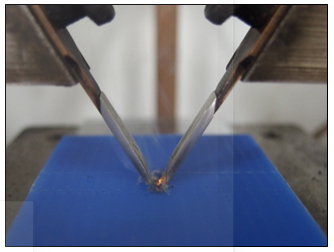 試験片表面に電位差及び湿潤汚損がある場合、表面漏れ電流によるジュール熱が発生します。その熱により湿潤汚損箇所が部分的に乾燥し導電路が分断され、局部的な微小発光放電(シンチレーション)を生じ、やがてはトラッキング破壊に至ります。電界液滴下法は電解液を用いてトラックの発生を誘導する方法で、規定の滴下数でトラッキング破壊しない電圧を求めることで評価します。