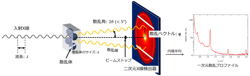 ラボ用のX線散乱装置では評価の難しいサンプルについても、放射光施設の産業利用枠を必要に応じて活用して放射光X線を利用した質の高い散乱像を得ることによって、多様な解析を可能にします。放射光施設を利用した測定では、高輝度X線を活かした温度可変測定、時分割測定などのアドバンスドな測定が可能です。材料内部構造の変化をリアルタイムかつ高精度に評価でき、基礎研究から製品開発まで幅広く活用いただけます。また、散乱プロファイルのモデル式へのフィッティングなど、解析のみのご相談にも対応します。