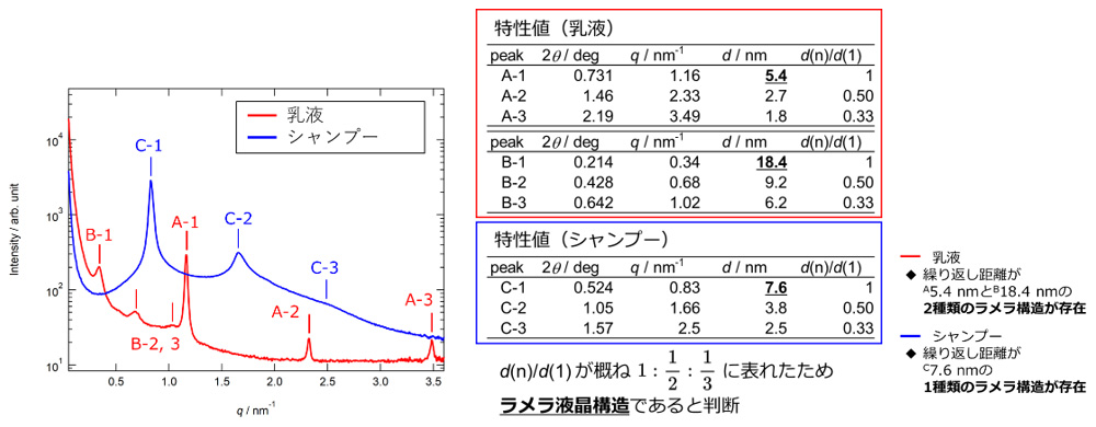 小角X線散乱法による香粧品中のラメラ構造の評価事例を以下に示します。乳液とシャンプーの2種類の試料に対して、小角X線散乱法を適用しました。2次元X線散乱像から、香粧品中の構造に由来する周期的な散乱強度の増減が見られました。得られた2次元X線散乱像の円環平均を取ることによって、1次元のX線散乱プロファイルを得ました。ピークの位置から、これらのピークはラメラ構造に由来するものであることがわかり、乳液試料では繰り返し距離が5.4 nmと18.4 nmの2種類のラメラ構造が、シャンプー試料では繰り返し距離が7.6 nmの1種類のラメラ構造が存在していることがわかりました。